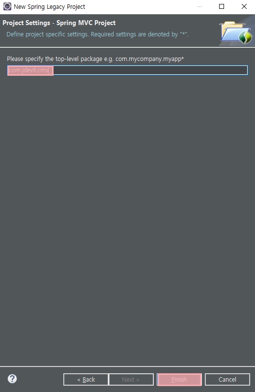 프로젝트명은 cms-solution이라 하고 스프링 MVC로 프로젝트를 만들 것이기 때문에 Spring MVC Project를 선택해주었다.