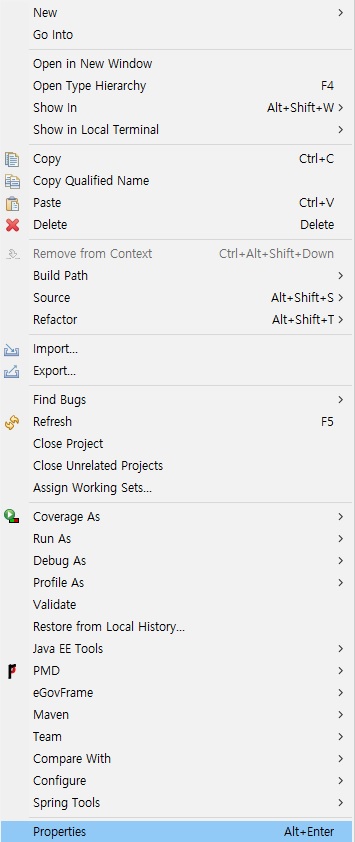 프로젝트 명에서 마우스 우클릭 후 -> Properties를 선택