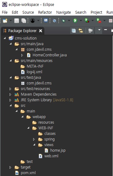 그림과 같은 폴더구조를 가지는 스프링 MVC 프로젝트가 생성되었다. 이제 서버를 구동하여 웹페이지를 브라우저에서 확인해보자.