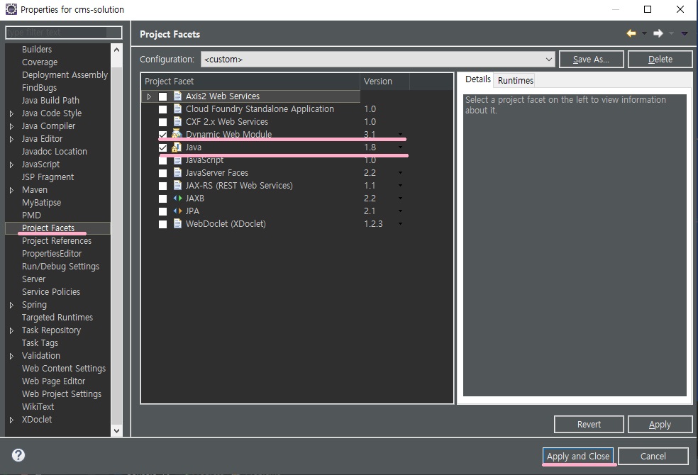 3. 프로젝트 Properties에서 Project Facets 탭 안에 Dynamic Web Module, Java 버전을 변경해준다.