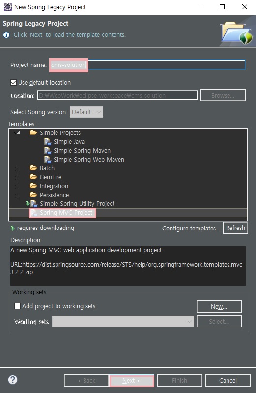 프로젝트명은 cms-solution이라 하고 스프링 MVC로 프로젝트를 만들 것이기 때문에 Spring MVC Project를 선택해주었다.